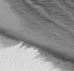April 1999 -- It is summer now in the northern hemisphere of Mars, and the north polar ice cap has retreated considerably since it was last viewed in detail by the Mars Global Surveyor Mars Orbiter Camera in September 1998 (see 1998 Polar List). This new [sic], high-resolution view shows the edge of the retreating polar cap as a bright, wind-streaked surface seen at the lower left. The ridges and tiny buttes and pits in the upper and right portions of the picture are part of the polar cap's layered deposits--stacks of dust and ice built up over the millennia. The picture covers an area 2.6 kilometers (1.6 miles) wide and is illuminated from the upper right.