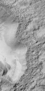 The new high resolution image (right) covers an area only 1.5 kilometers (0.9 miles) wide and shows that the crater floor--which appears relatively smooth in the context view on the left--is actually quite rough at the scale that a human being would notice if trying to hike around in this landscape. The latest picture also shows small, bright windblown dunes that were not visible in the earlier MOC image.