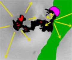 The Galileo camera took the pictures, while the temperatures were measured by the spacecraft's near infrared mapping spectrometer instrument. Combining these data, Galileo scientists have created a description of the eruption at Prometheus. The magma is stored in an underground chamber beneath the caldera (dark, bean-shaped feature) at the northeastern end of Prometheus (top right). The lava reaches the surface about 15 kilometers (10 miles) south of the caldera. This point is marked by the blue, eastern hot spot in the temperature map and by a streak of red, sulfur-rich material (see color panel on the lower left). From the volcanic vent, the lava travels almost 100 kilometers (60 miles) through lava tubes to the front of the flow. The exposed liquid lava produces the large high temperature area on the western end of Prometheus (color panel at lower left). A 100 kilometer (60 mile) tall plume of sulfur-dioxide rich gas also rises above these active lava flows. A smaller breakout of liquid lava midway along the tube forms a faint (purple) hot spot.