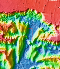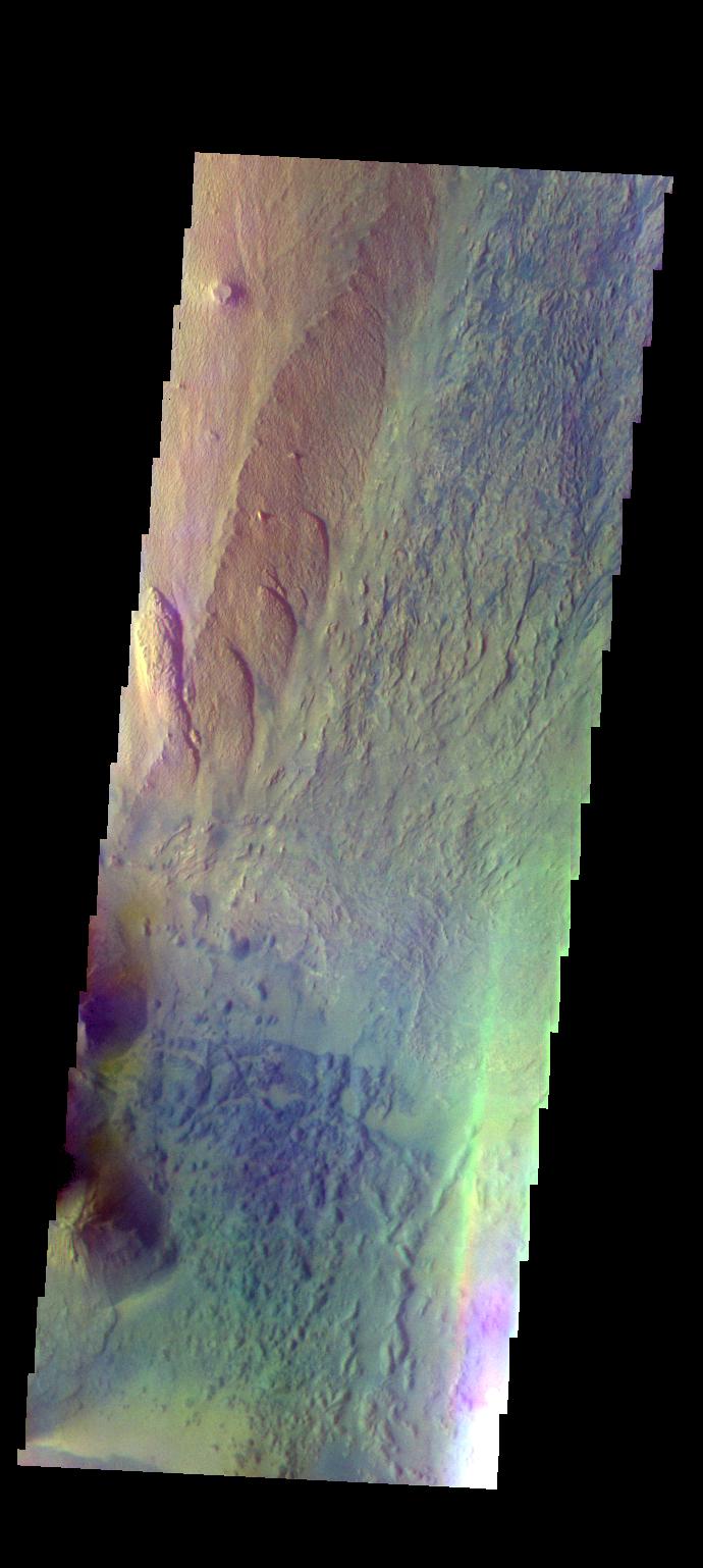 The THEMIS VIS camera contains 5 filters. The data from different filters can be combined in multiple ways to create a false color image. These false color images may reveal subtle variations of the surface not easily identified in a single band image. Today's false color image shows part of Ophir Chasma. The reddish toned feature on the left side of the image is a high standing ridge called Baetis Mensa.