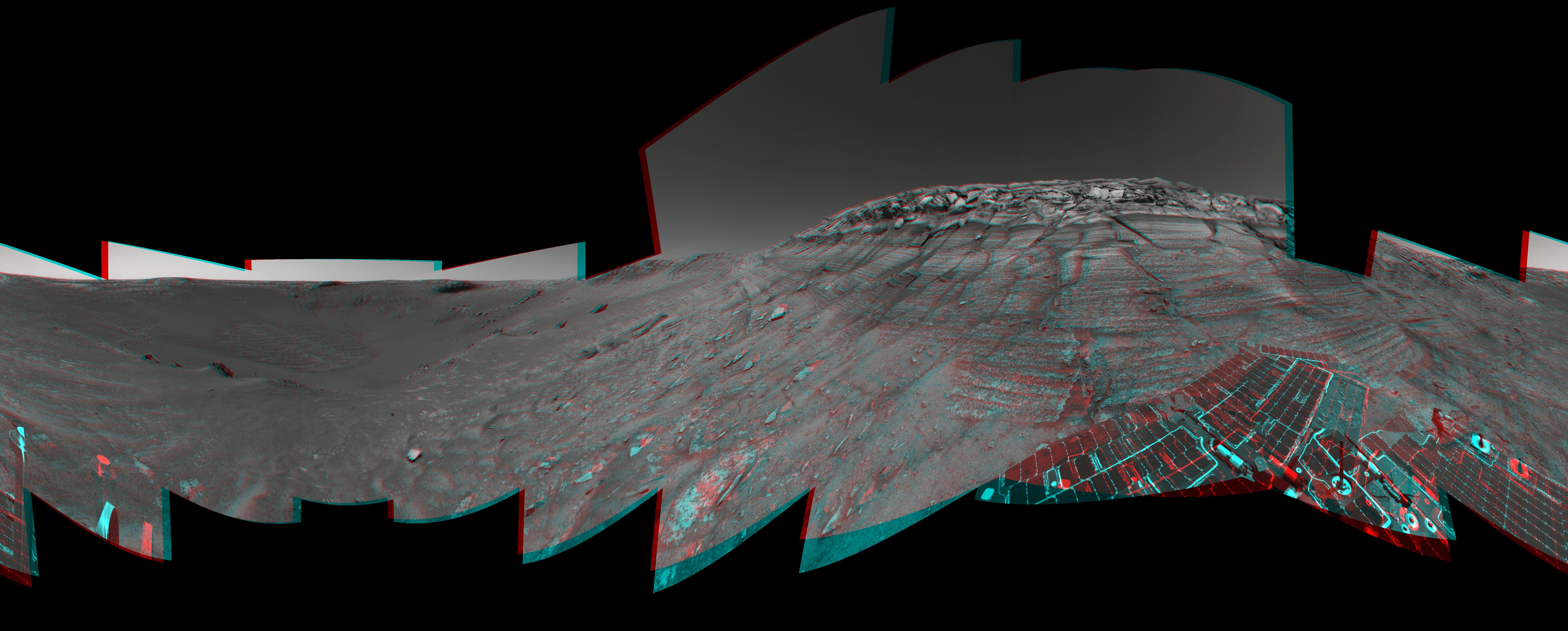 The navigation camera on NASA's Mars Exploration Rover Opportunity took images during the rover's 285th martian day (Nov. 11, 2004) that are combined into this stereo panorama. Opportunity had reached the base of "Burns Cliff," a portion of the inner wall of "Endurance Crater." This view shows rock layers in the wall, with a portion of Opportunity's solar array visible at the bottom right.
