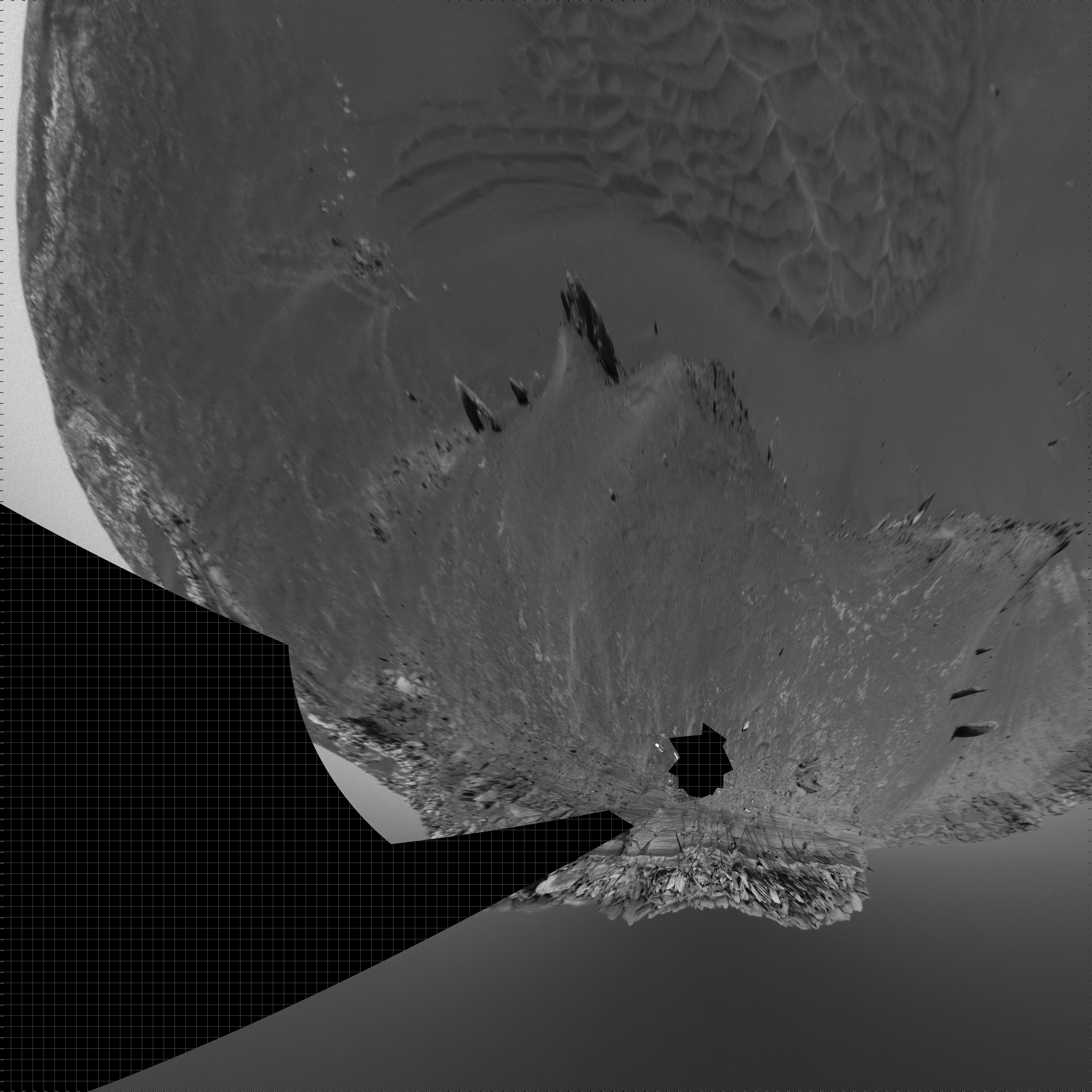 The navigation camera on NASA's Mars Exploration Rover Opportunity took images during the rover's 285th martian day (Nov. 11, 2004) that are combined into this 360-degree panorama. Opportunity had reached the base of "Burns Cliff," a portion of the inner wall of "Endurance Crater." This view shows rock layers in the wall. The rover's position when taking the images was labeled Opportunity site 37, position 550. This view is presented in a vertical projection with geometric seam correction.