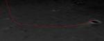 In this close-up view of the path Opportunity took when it landed at Meridiani Planum, Mars, a computer-generated red line shows the spacecraft's bounce motions as it landed at Meridiani Planum, Mars. The spacecraft bounced north approximately 26 times while safely encased in airbags, until it came to a stop inside the crater to the right of the image. The red line is superimposed on a mosaic of the three images taken during descent by the descent image motion estimation system camera, located on the bottom of the lander.