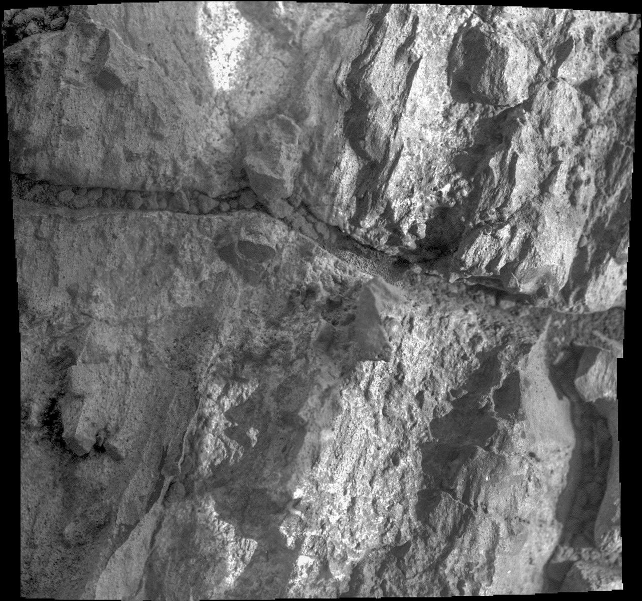 The view covers an area about 2 inches (5 centimeters) wide. Opportunity's inspection found Gasconade to be a wind-etched outcrop with angular bits of darker rock within a lighter matrix, which may have been formed from fallout of the impact event that excavated the crater.