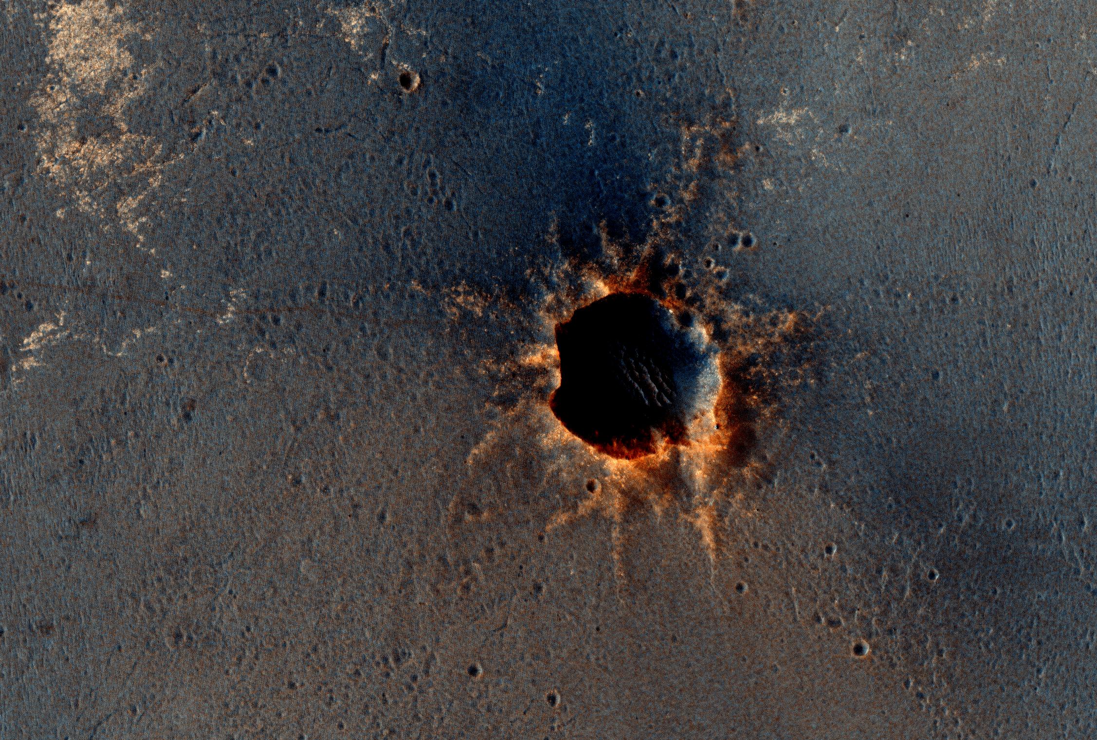 Opportunity has been studying this relatively fresh, 90-meter-diameter (295-foot-diemeter) crater to better understand how crater excavation occurred during the impact and how it has been modified by weathering and erosion since. Note the bright blocks and rays of ejecta surrounding the crater.