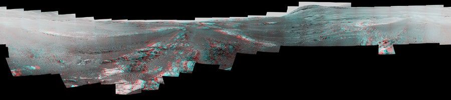 This image is a shortened version of a 360-degree panorama taken by the Opportunity rover's Panoramic Camera (Pancam) from May 13 through June 10, 2018, or sols (Martian days) 5,084 through 5,111. This is the last panorama Opportunity acquired before the solar-powered rover succumbed to a global Martian dust storm on the same June 10. The panorama appears in 3D when seen through blue-red glasses with the red lens on the left.