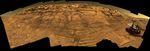This is a composite of 46 different images, each acquired in seven different Pancam filters. It is an approximately true-color rendering generated from the panoramic camera's 750-nanometer, 530-nanometer and 430-nanometer filters. The mosaic spans more than 180 degrees side to side. Because of this wide-angle view, the cliff walls appear to bulge out toward the camera. In reality the walls form a gently curving, continuous surface. See PIA07110.