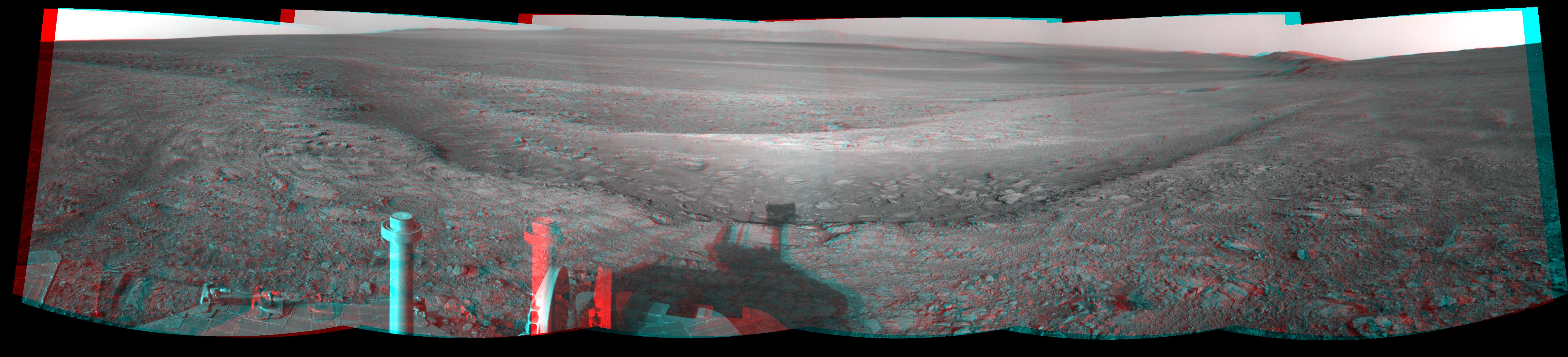 This stereo view from the navigation camera on NASA's Mars Exploration Rover Opportunity shows a vista across Endeavour Crater, with the rover's own shadow in the foreground. The view spans 216 compass degrees, from north at the left to south-southwest on the right. It appears three-dimensional when seen through blue-red glasses with the red lens on the left.