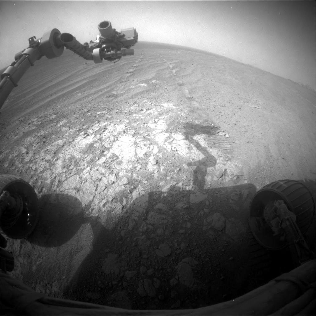 The scene includes Opportunity's robotic arm, called the "instrument deployment device," at upper left. Portions of the pale bedrock exposed on the ground in front of the rover are within the arm's reach. Researchers used instruments on the arm to examine a target called "Calera" on this patch of bedrock. The wheel tracks in the scene are from the drive -- in reverse -- to this location, a drive of 32.5 feet (9.9 meters) on Sol 3846 (Nov. 18, 2014).