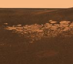 This high-resolution image captured by the Mars Exploration Rover Opportunity's panoramic camera highlights a portion of the puzzling rock outcropping that scientists eagerly wait to investigate. Presently, Opportunity is on its lander facing northeast; the outcropping lies to the northwest. These layered rocks measure only 10 centimeters (4 inches) tall and are thought to be either volcanic ash deposits or sediments carried by water or wind. Data from the panoramic camera's near-infrared, blue and green filters were combined to create this approximate true color image.