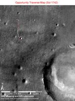The red line on this image traces the route that NASA's Mars Exploration Rover Opportunity drove from its landing inside Eagle Crater on Jan. 4, 2004 (Universal Time; Jan. 3 Pacific Standard Time) through the 1,742nd Martian day, or sol, of the mission (Dec. 17, 2008). During that period, Opportunity drove 13.62 kilometers (8.5 miles).