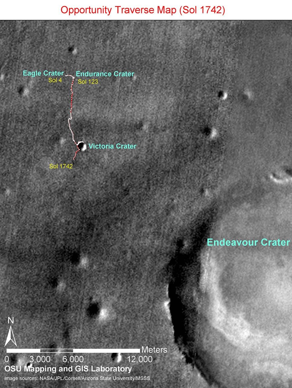 Opportunity climbed out of the 800-meter-wide (half-mile-wide) Victoria Crater on Sol 1634 (Aug. 28, 2008) after spending almost 12 months exploring the crater's interior and the preceding 12 months examining it from the rim. The rover's next major destination is a much larger crater further south, Endeavour Crater, with a diameter of about 22 kilometers (14 miles).