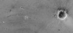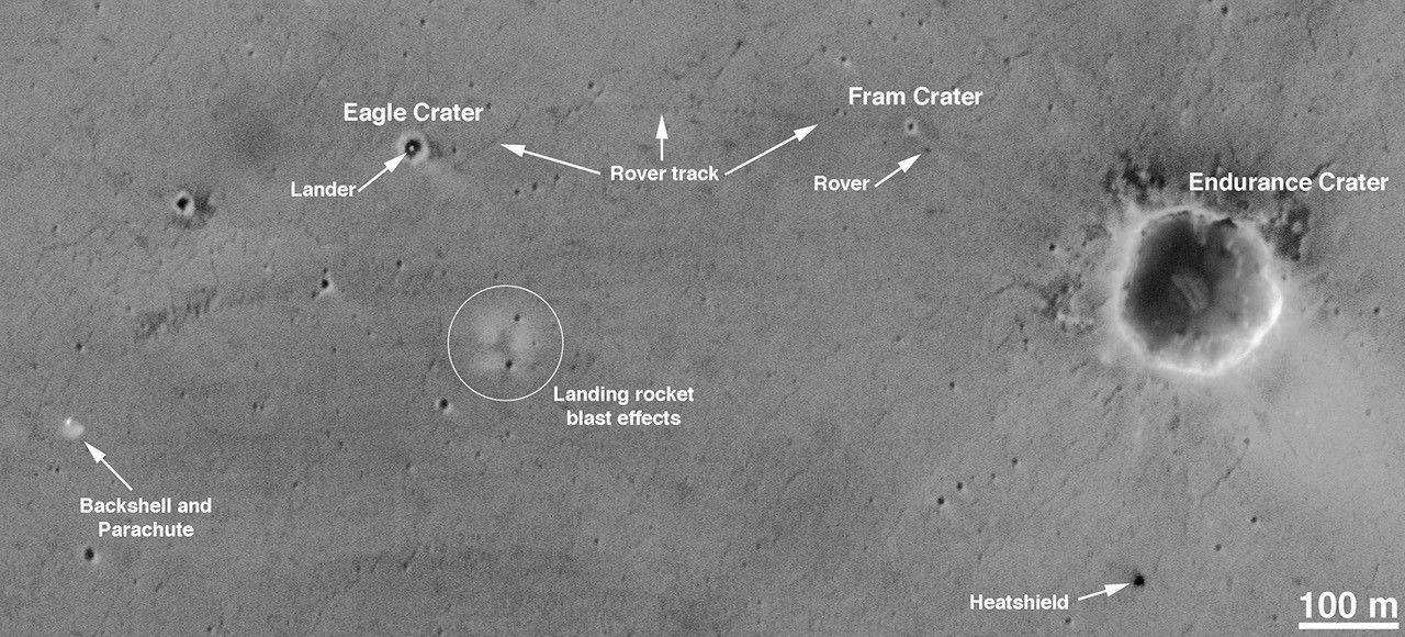 The image was acquired on April 26, 2004, during Opportunity's 91st martian day, or sol. That was the first day of Opportunity's extended mission, and the rover had recently completed exploration of small "Fram Crater" on the route from its landing site toward "Endurance Crater," where it would eventually spend six months. The rover itself can be seen in this image -- an amazing accomplishment, considering that the orbiter was nearly 400 kilometers (nearly 250 miles) away at the time! Also visible and labeled on this image are the spacecraft's lander, backshell, parachute and heat shield, plus effects of its landing rockets.