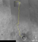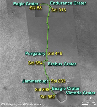 This map of Opportunity's trek so far is overlaid onto images taken by the Mars Orbiter Camera on NASA's Mars Global Surveyor. Victoria is about 800 meters (one-half mile) in diameter, or about five times wider than Endurance and 40 times wider than Eagle. The scale bar at lower right shows the length of 800 meters (0.50 mile). North is up.