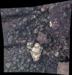 Geochemical data indicate the presence of magnesium and iron sulfates at this location, most likely corresponding to the white pebble visible near the center of the image. These sulfates may have formed by the interaction of acidic fluids with the rocks along the rim of Endeavour crater.