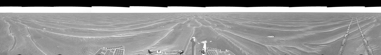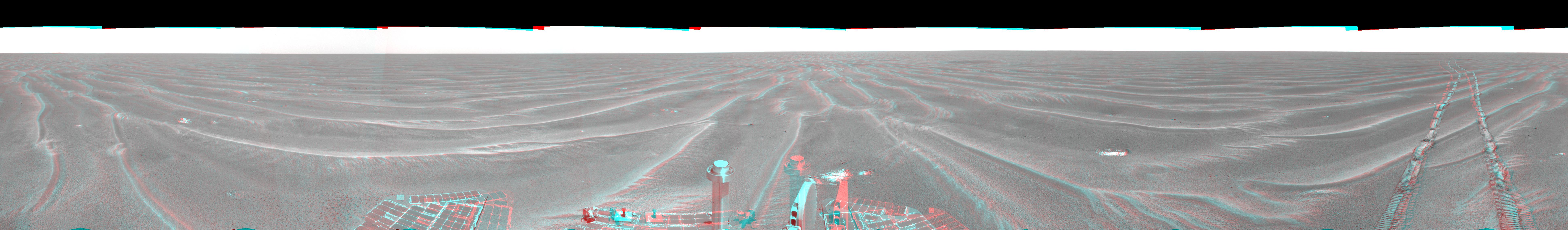 NASA's Mars Exploration Rover Opportunity used its navigation camera to take the images combined into this 360-degree view of the rover's surroundings on the 397th martian day, or sol, of its surface mission (March 6, 2005). Opportunity had completed a drive of 124 meters (407 feet) across the rippled flatland of the Meridiani Planum region on the previous sol, but did not drive on this sol. This location is catalogued as Opportunity's site 48. This three-dimensional view is presented as a cylindrical-perspective projection with geometric and brightness seam correction.