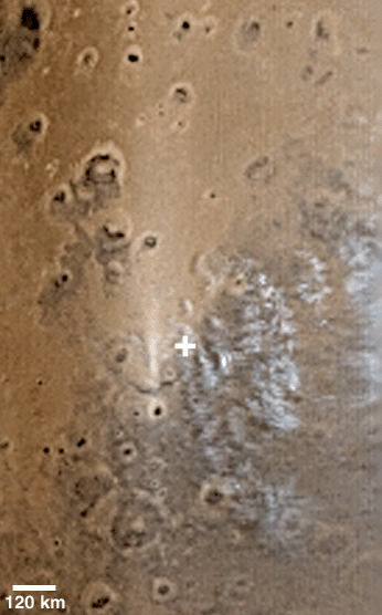 This composite of 7.5 km (4.7 mi) per pixel daily global images, acquired by the Mars Global Surveyor (MGS) Mars Orbiter Camera (MOC), shows water ice clouds over and to the east (right) of the Mars Exploration Rover (MER-B), Opportunity, landing site in Meridiani Planum. The "+" indicates the location of the rover site. Clouds high in the atmosphere above the Opportunity site have been a common occurrence in the afternoon for the past several weeks. This picture was obtained on 1 May 2004. The scale bar, 120 km (~75 mi), is approximate. North is toward the top/upper right. The bright area to the west (left) of the landing site is sunlight glinting off particles in the atmosphere and on the ground. The sun illuminates the scene from the left.