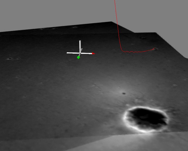 In this side view of the path the Mars Exploration Rover Opportunity took when it landed at Meridiani Planum, Mars, a computer-generated red line shows the path of the spacecraft's descent and bouncing along the surface. The line is superimposed on a mosaic of the three images taken during descent by the descent image motion estimation system camera, located on the bottom of the lander. Initially, the Opportunity lander was traveling east, but near the end of its descent, it began moving north. When the lander was released from the parachute, the spacecraft bounced to the north into the crater shown at the top of the image. North is indicated by the red-tipped white arrow in the coordinate axes and east, by the green-tipped white arrow.