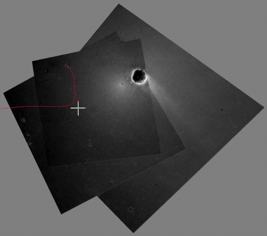 This computer-generated visualization depicts an overhead view of the path Opportunity took when it landed at Meridiani Planum, Mars. A red line shows the path of the spacecraft's descent and bouncing along the surface. The line is superimposed on a mosaic of the three images taken during descent by the descent image motion estimation system camera, located on the bottom of the lander. Initially, the Opportunity lander was traveling east, but near the end of its descent, it began moving north. When the lander was released from the parachute, the spacecraft bounced to the north into the crater shown at the top of the image. North is indicated by the red-tipped white arrow in the coordinate axes and east, by the green-tipped white arrow.