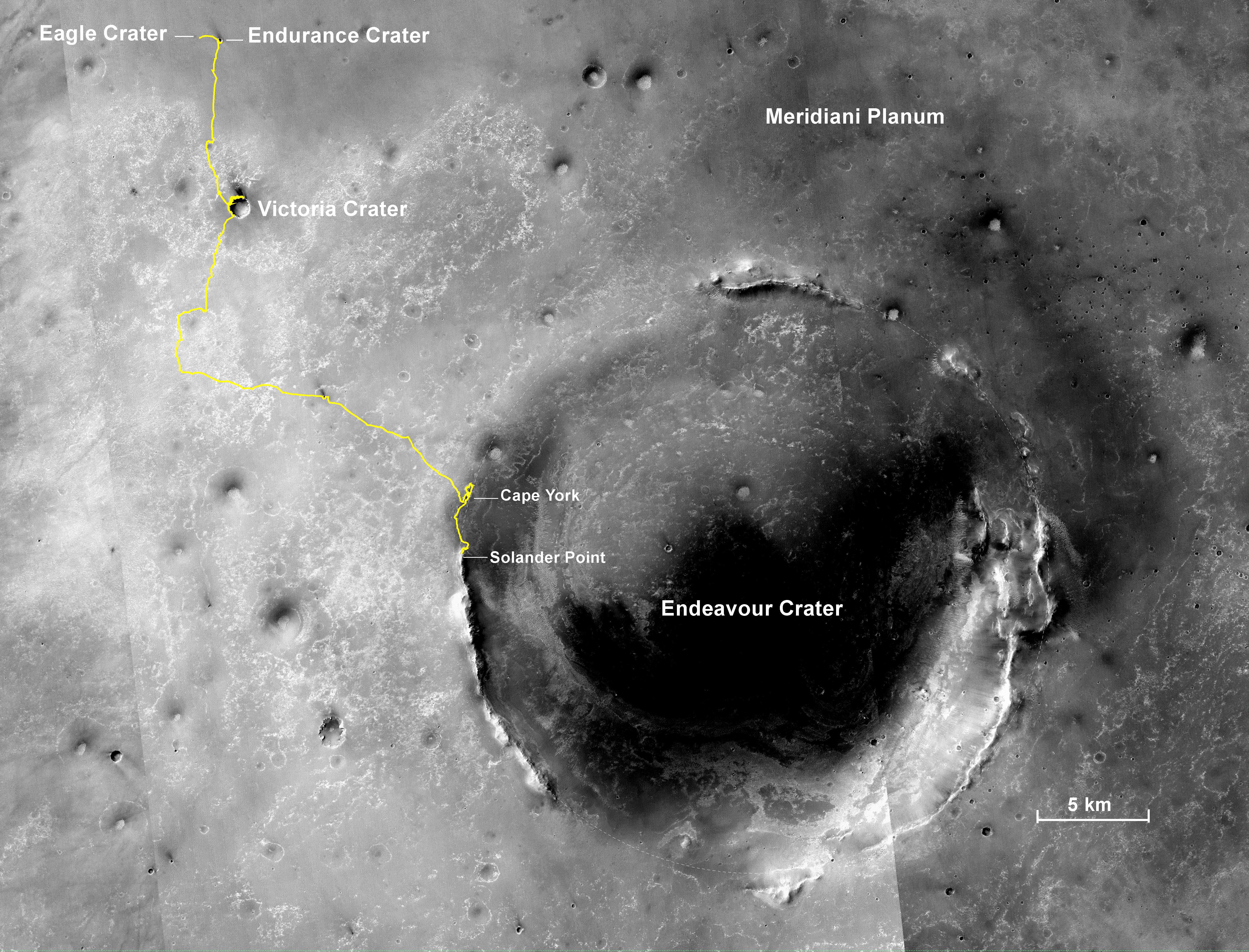 NASA's Mars Exploration Rover Opportunity has been working on Mars since landing inside Eagle Crater on Jan. 25, 2004 (Universal Time; evening of Jan. 24, Pacific Standard Time). The gold line on this image shows Opportunity's route from the landing site, in upper left, to the area it is investigating on the western rim of Endeavour Crater as the date approaches for the rover's 10th anniversary on Mars, in Earth years.
