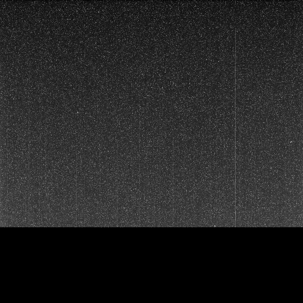 Opportunity took this image with the left eye of the Pancam, with its solar filter pointed at the Sun. But since the dust storm blotted out the Sun, the image is dark. The white speckles are noise from the camera. All Pancam images have noise in them, but the darkness makes it more apparent. The transmission stopped before the full image was transmitted, leaving the bottom of the image incomplete, represented here as black pixels.