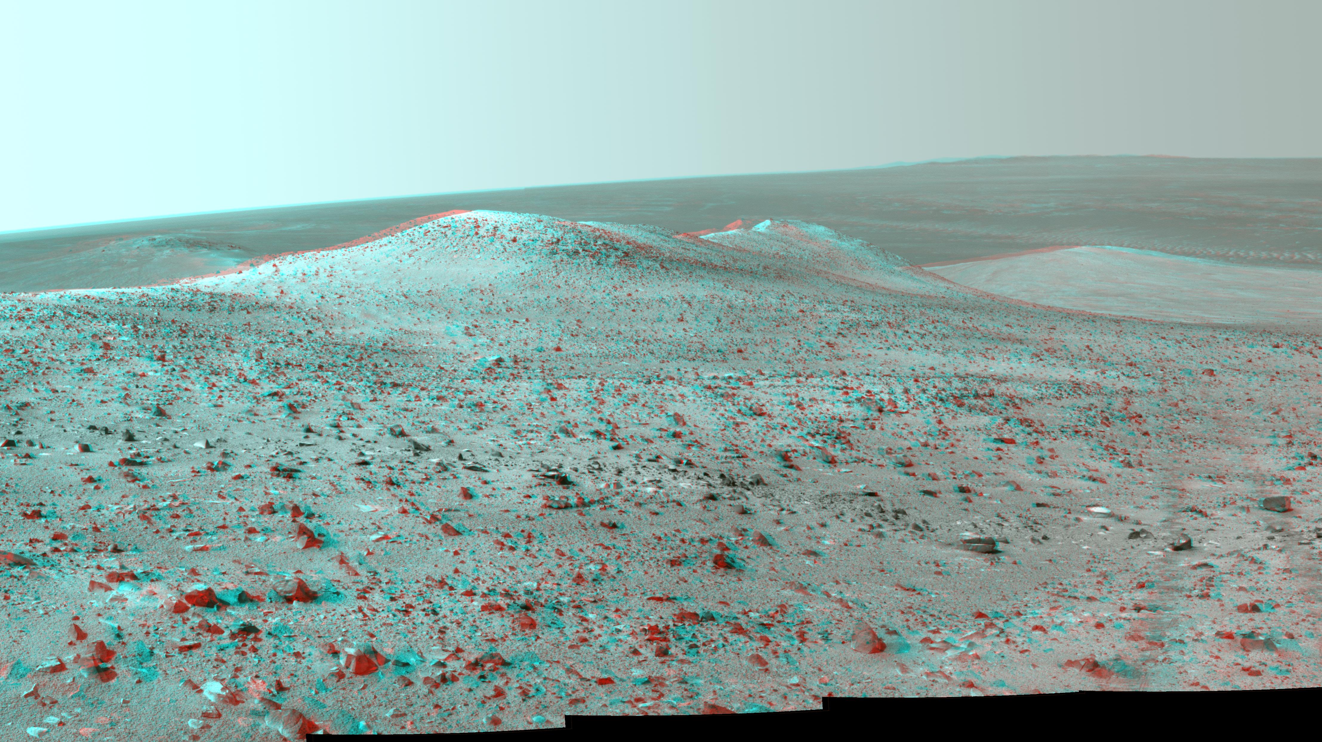 This stereo vista from NASA's Mars Exploration Rover Opportunity shows "Wdowiak Ridge," from left foreground to center, as part of a northward look with the rover's tracks visible at right. The image combines views from the left eye and right eye of Opportunity's panoramic camera (Pancam) to appear three-dimensional when seen through blue-red glasses with the red lens on the left.