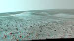 This panorama spans about 70 compass degrees from north-northwest on the left to east-northeast on the right. Wdowiak Ridge rises steeply about 40 feet from base to top. It extends about 500 feet (150 meters) in length. For scale, the distance between Opportunity's parallel wheel tracks is about 3.3 feet (1 meter).