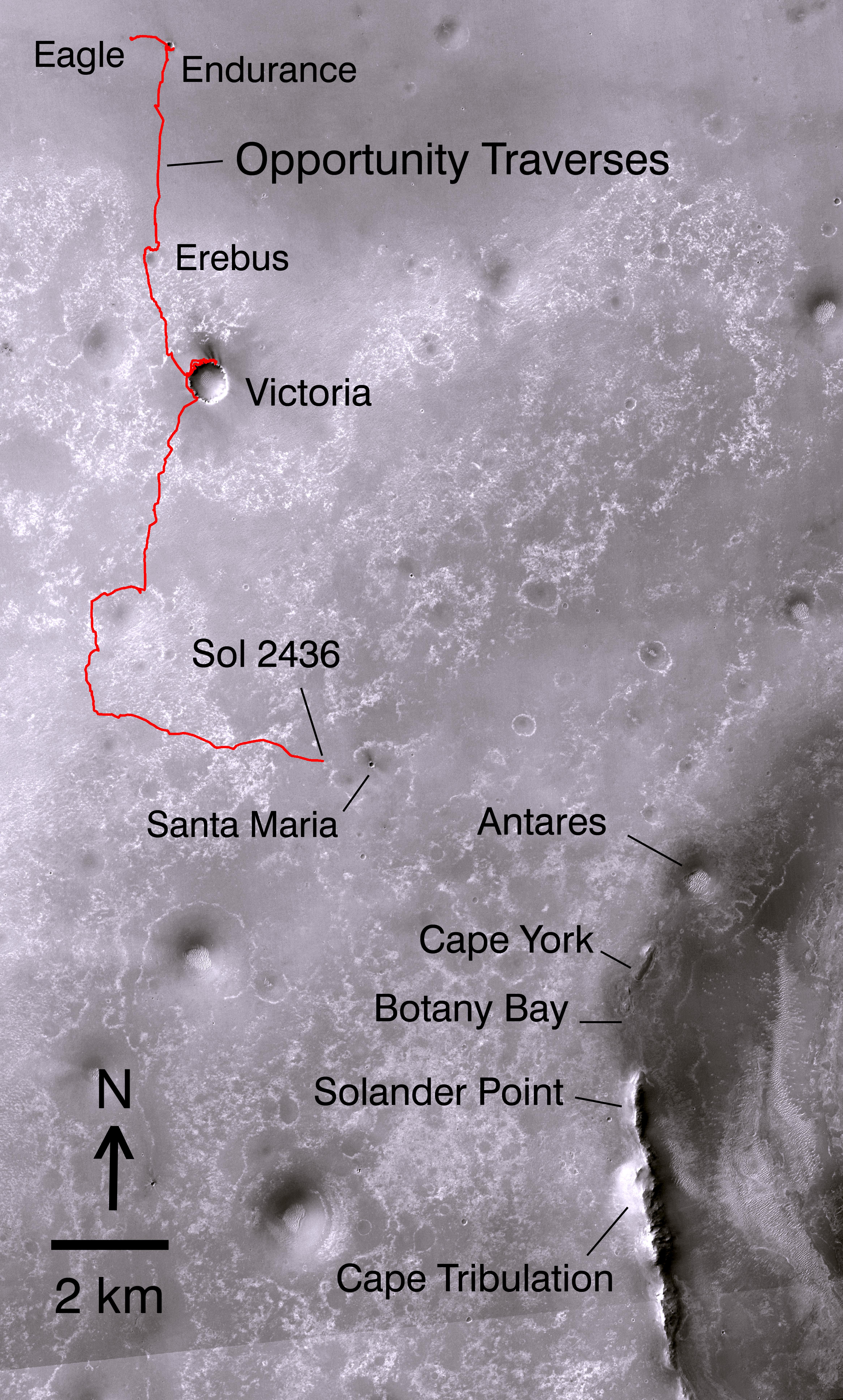 Drives subsequent to Sol 2436 in early December 2010 brought Opportunity closer to Santa Maria Crater, which is about 90 meters (295 feet) in diameter. The rover team plans to investigate Santa Maria for a few weeks before resuming Opportunity's long-term trek toward the rim of Endeavour Crater. The western edge of 22-kilometer-wide (14-mile-wide) Endeavour is in the lower right corner of this map. Some sections of the discontinuos raised rim and nearby features are indicated with informal names on the map: rim segments "Cape York" and "Solander Point"; a low area between them called "Botany Bay"; "Antares" crater, which formed on sedimentary rocks where the rim was eroded down; and rim fragment "Cape Tribulation," where orbital observations have detected clay minerals.