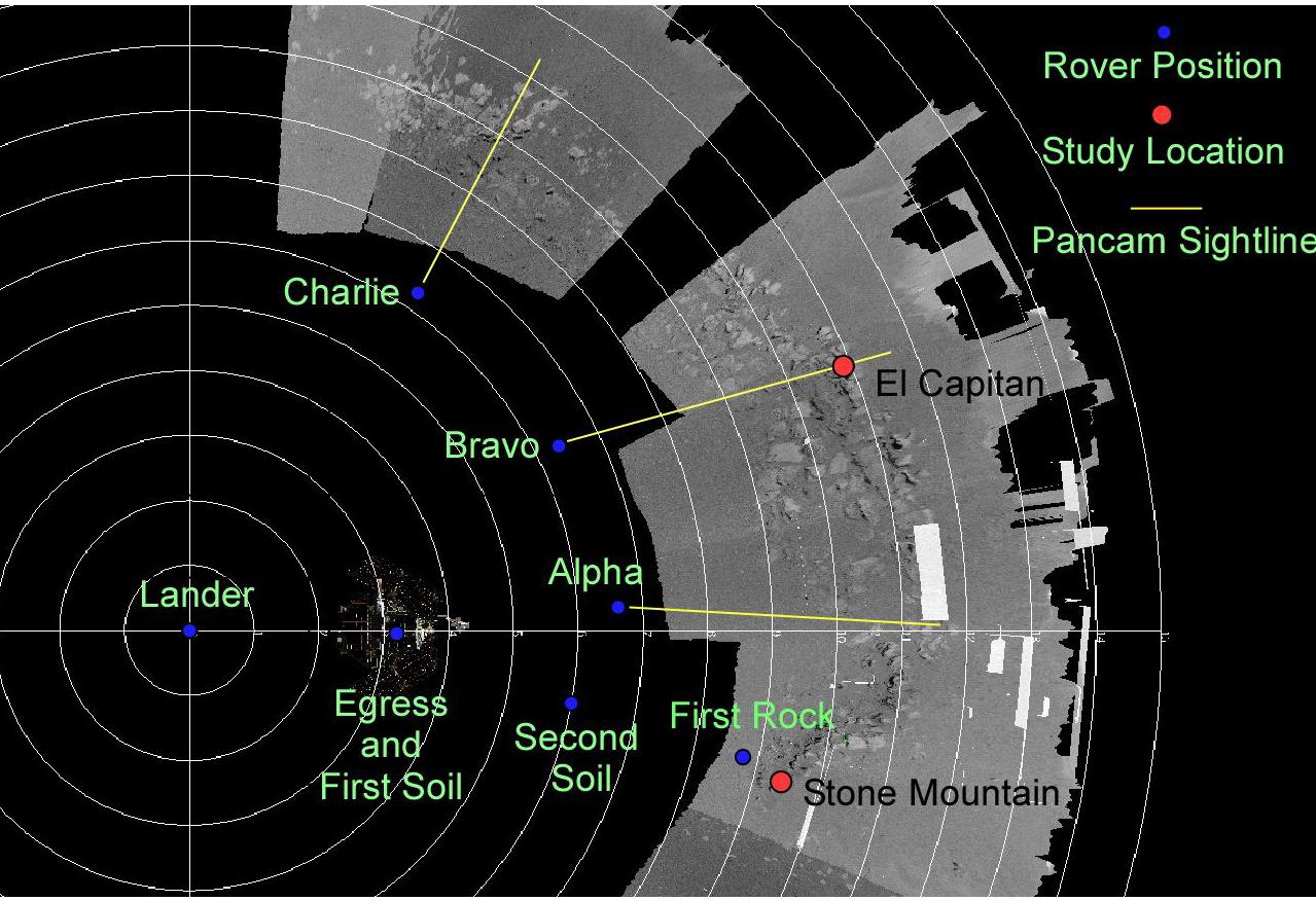 The red dots represent the center points of the target areas for the instruments on the rover mast (the panoramic camera and miniature thermal emission spectrometer). Opportunity visited Stone Mountain on Feb. 5. Stone Mountain was named after the southernmost point of the Appalachian Mountains outside of Atlanta, Ga. On Earth, Stone Mountain is the last big mountain before the Piedmont flatlands, and on Mars, Stone Mountain is at one end of Opportunity Ledge. El Capitan is a target of interest on Mars named after the second highest peak in Texas in Guadaloupe National Park, which is one of the most visited outcrops in the United States by geologists. It has been a training ground for students and professional geologists to understand what the layering means in relation to the formation of Earth, and scientists will study this prominent point of Opportunity Ledge to understand what the layering means on Mars.