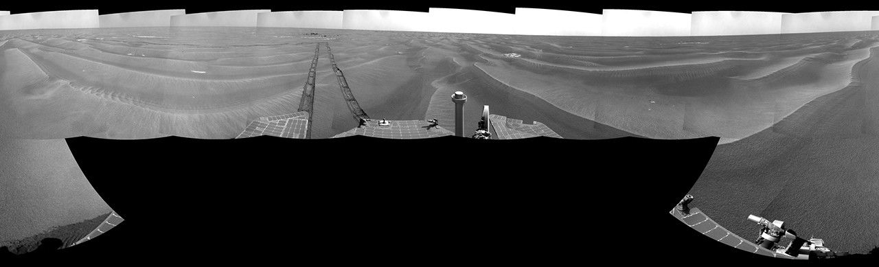 NASA's Mars Exploration Rover Opportunity used its navigation camera to take the images combined into this full-circle view of the rover's surroundings during the 1,820th to 1,822nd Martian days, or sols, of Opportunity's surface mission (March 7 to 9, 2009).