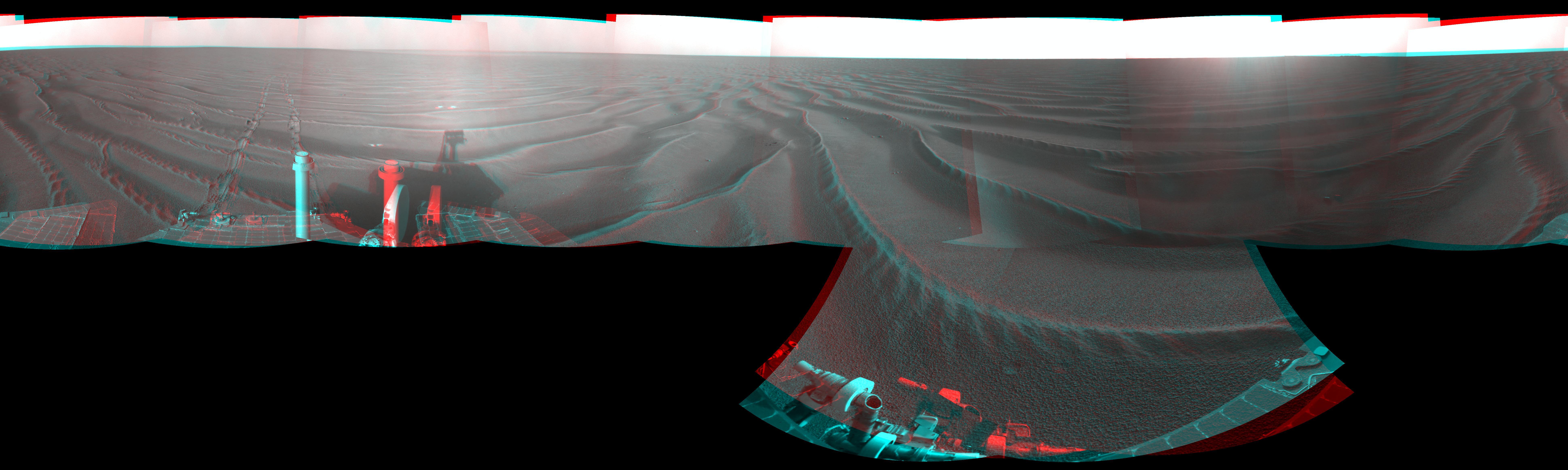NASA's Mars Exploration Rover Opportunity used its navigation camera to take the images combined into this stereo, 360-degree view of the rover's surroundings on the 1,687th Martian day, or sol, of its surface mission (Oct. 22, 2008). The view appears three-dimensional when viewed through red-blue glasses.