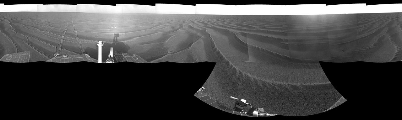 Opportunity had driven 133 meters (436 feet) that sol, crossing sand ripples up to about 10 centimeters (4 inches) tall. The tracks visible in the foreground are in the east-northeast direction.