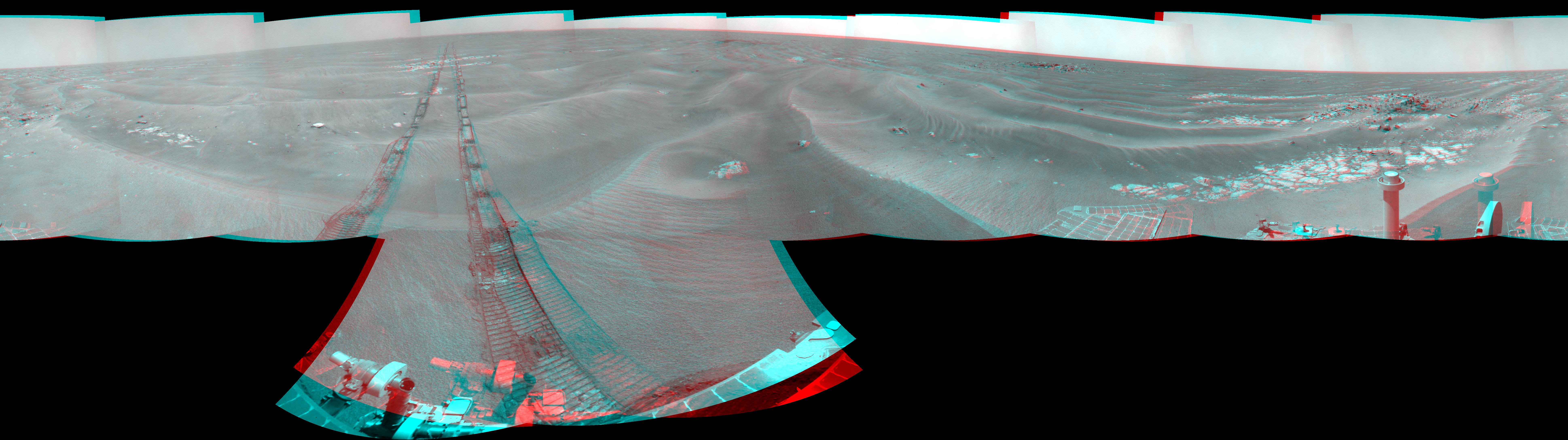 NASA's Mars Exploration Rover Opportunity used its navigation camera to take the images combined into this 360-degree stereo view of the rover's surroundings on the 1,950th Martian day, or sol, of its surface mission (July 19, 2009). The view appears three-dimensional when viewed through red-blue glasses with the red lens on the left. South is in the middle; north at both ends.