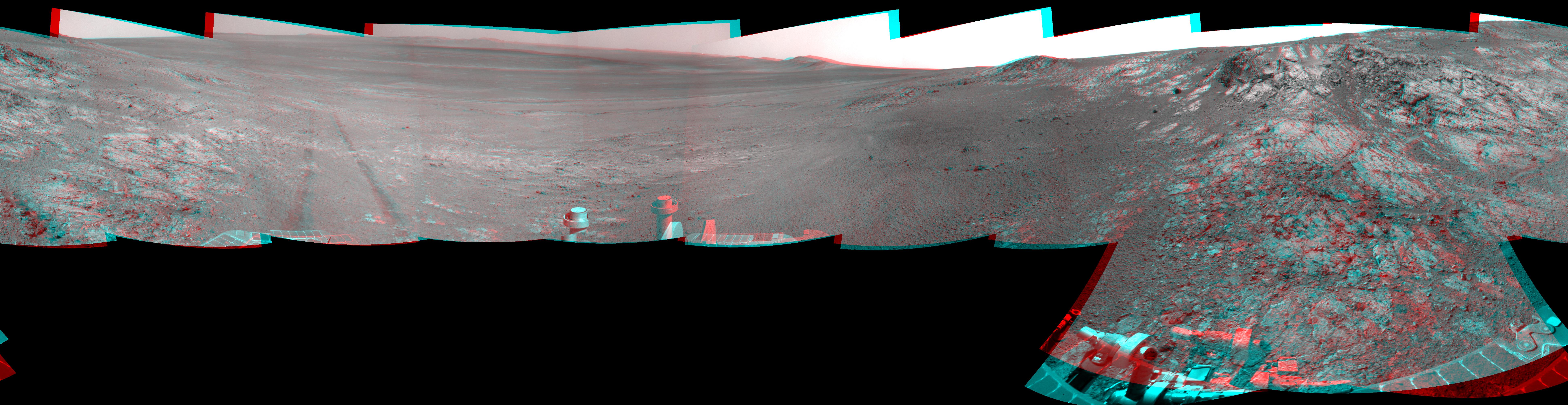 This full-circle, stereo panorama shows the terrain around the NASA Mars Exploration Rover Opportunity during the 3,105th Martian day, or sol, of the rover's work on Mars (Oct. 18, 2012). It was assembled from images taken by the rover's navigation camera. The view appears in three dimensions when viewed through red-blue glasses with the red lens on the left.