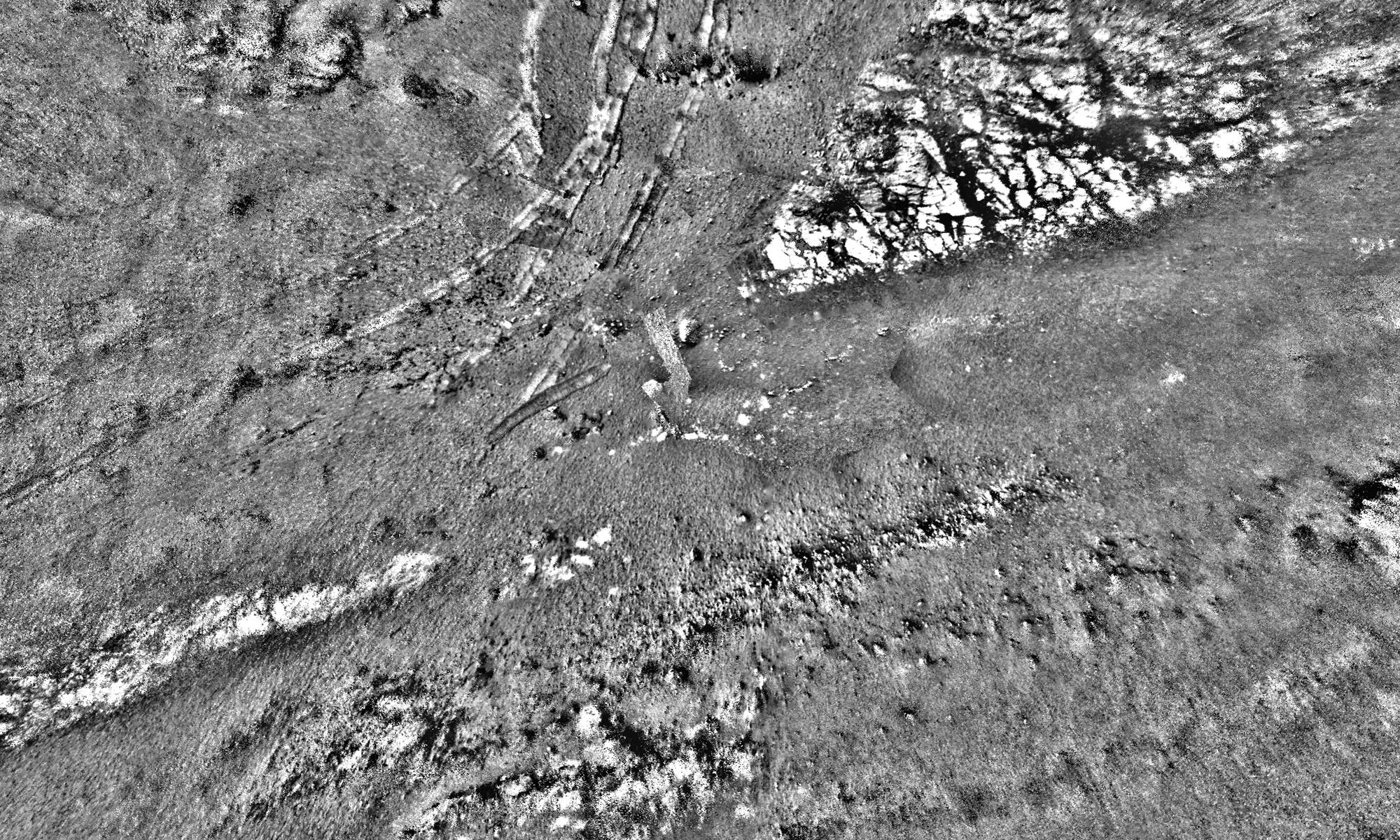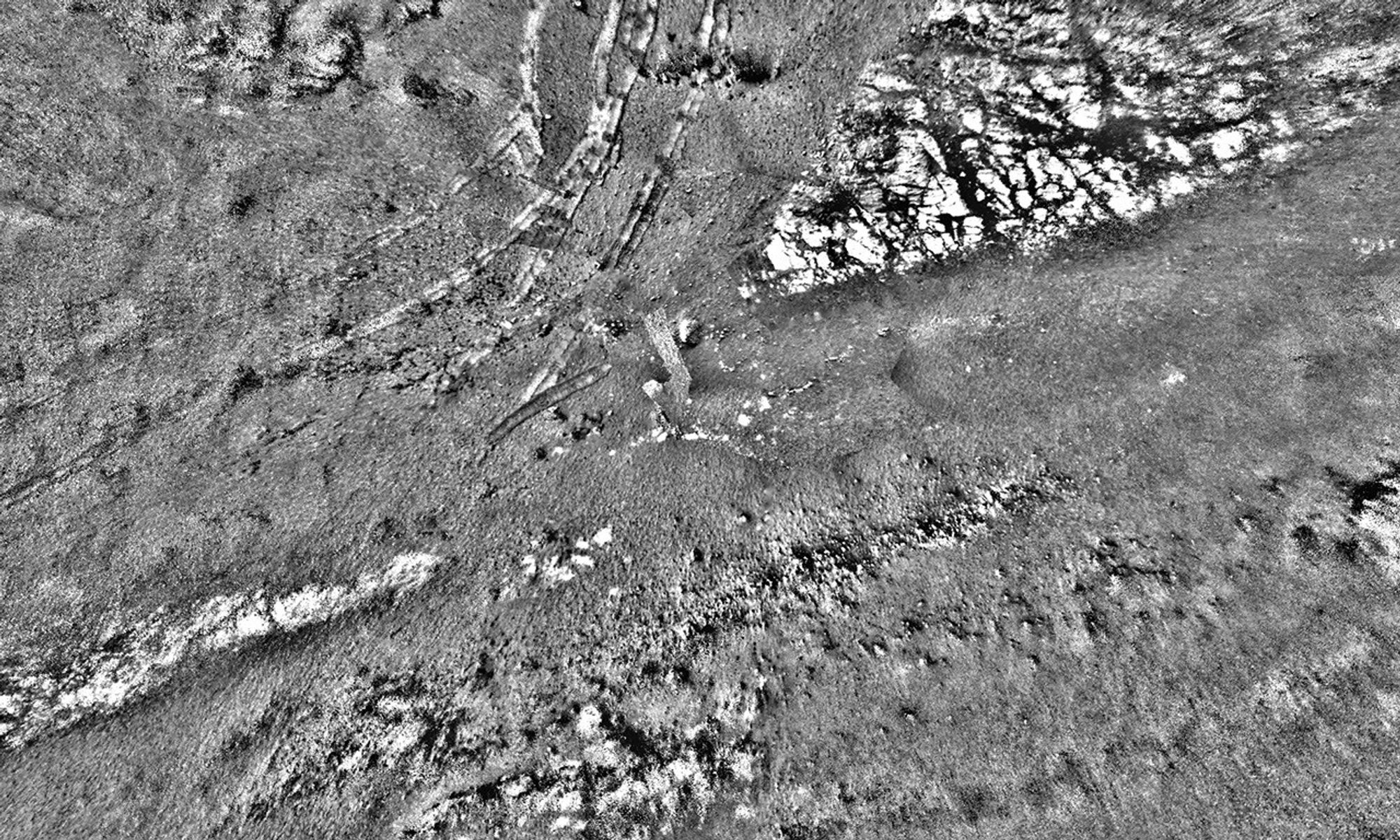 The mosaic has a resolution of about 1 centimeter per pixel; the scene width is 66 feet (20 meters) while the scene height is 39 feet (12 meters). The rover wheel tracks are about 3 feet (1 meter) apart. Shading differences between frames have been adjusted so subtle surface details are more visible.