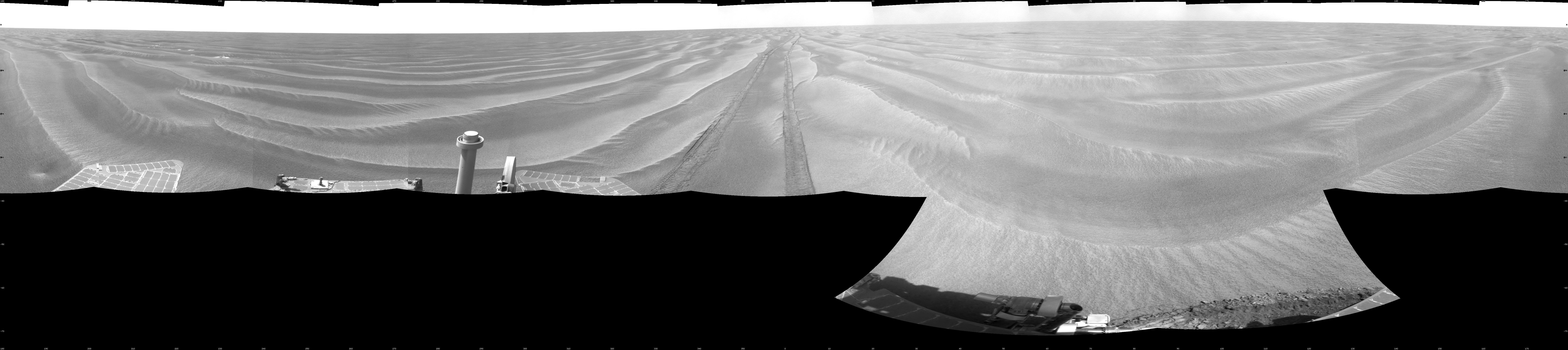 NASA's Mars Exploration Rover Opportunity used its navigation camera to take the images combined into this 360-degree view of the rover's surroundings on the 1,912th Martian day, or sol, of its surface mission (June 10, 2009).