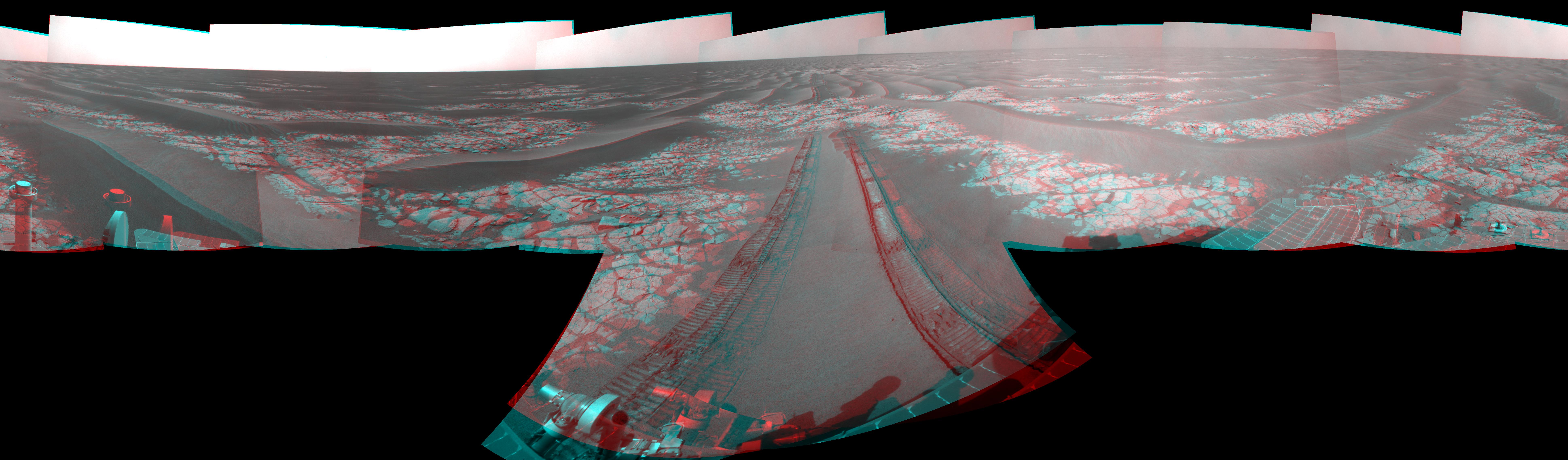 This view combines images from the left-eye and right-eye sides of the navigation camera. It appears three-dimensional when viewed through red-blue glasses with the red lens on the left.