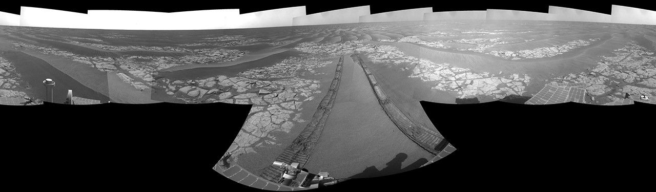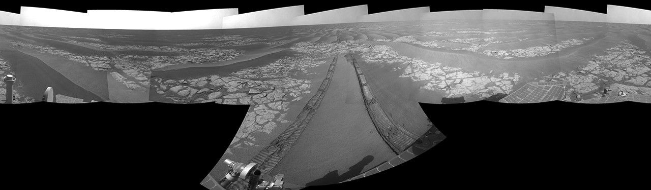 Tracks from the drive extend northward across dark-toned sand ripples and light-toned patches of exposed bedrock in the Meridiani Planum region of Mars. For scale, the distance between the parallel wheel tracks is about 1 meter (about 40 inches).