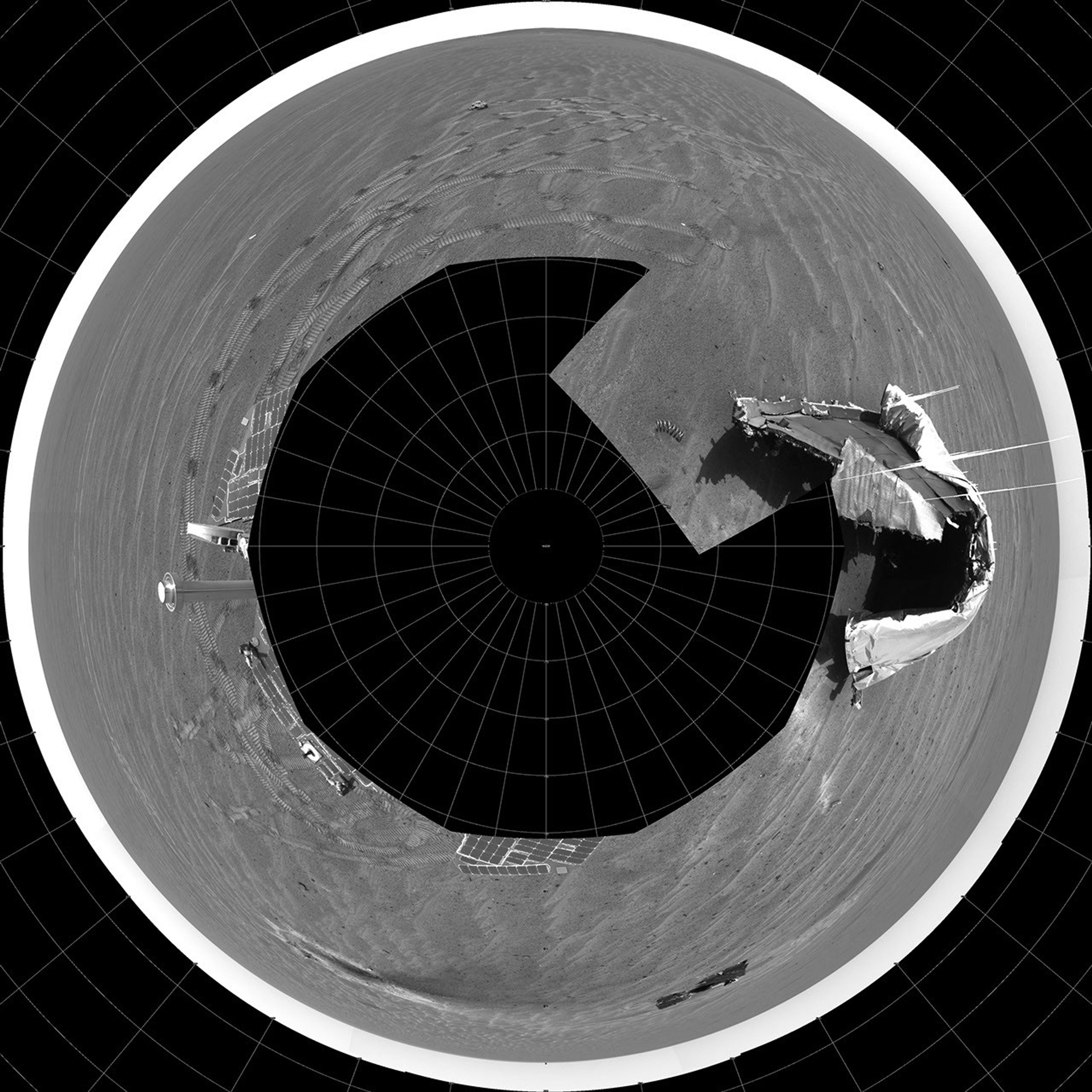 NASA's Mars Exploration Rover Opportunity captured this 360-degree panorama with its navigation camera on the rover's 354th martian day, or sol (Jan. 21, 2005). The view is presented as a polar projection with geometric seam correction. It includes the debris and impact divot from Opportunity's heat shield. The rim of "Endurance Crater" is visible on the horizon.