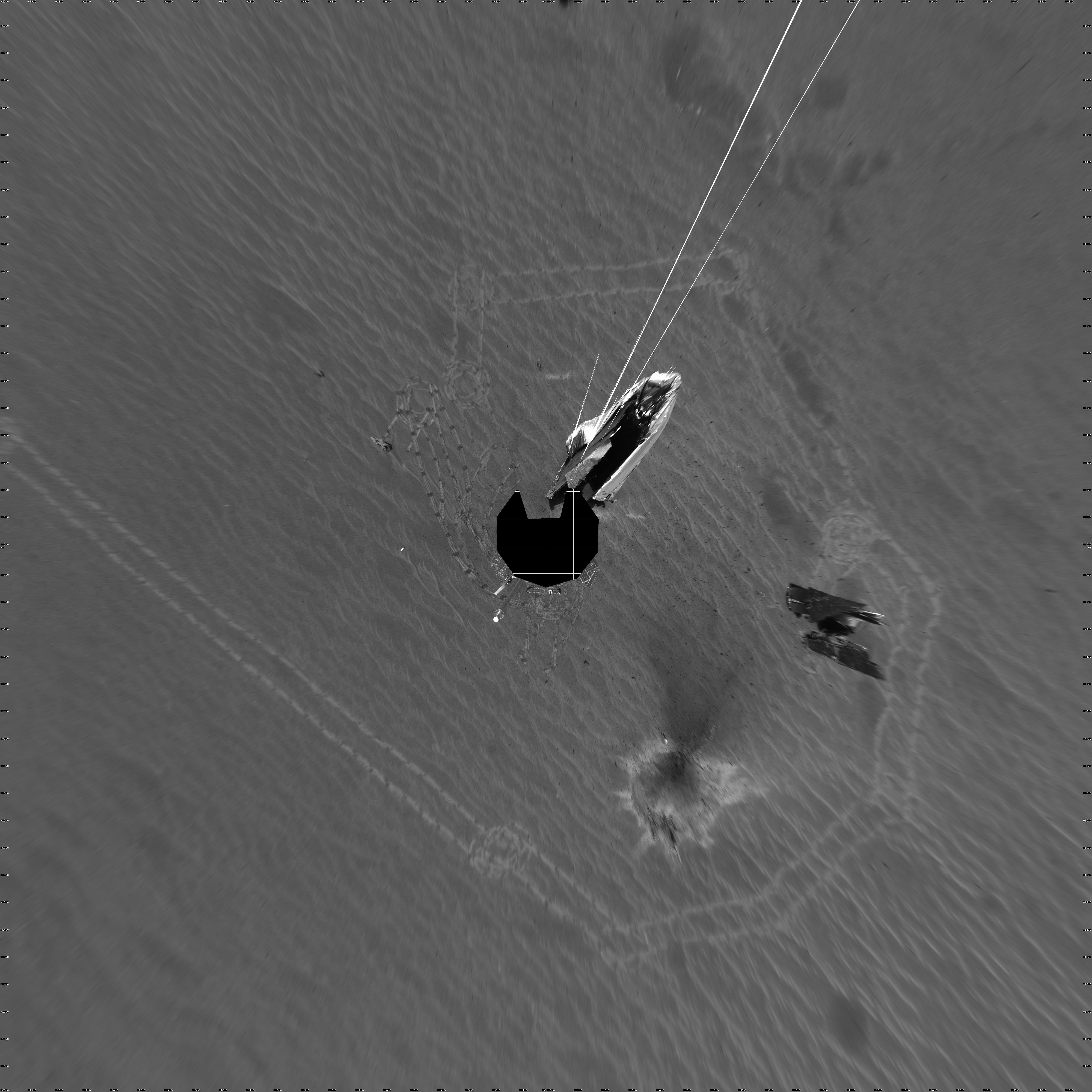 NASA's Mars Exploration Rover Opportunity captured this 360-degree panorama with its navigation camera on the rover's 354th martian day, or sol (Jan. 21, 2005). The view is presented as a vertical projection with geometric seam correction. It includes the debris and impact divot from Opportunity's heat shield. The rim of "Endurance Crater" is visible on the horizon.