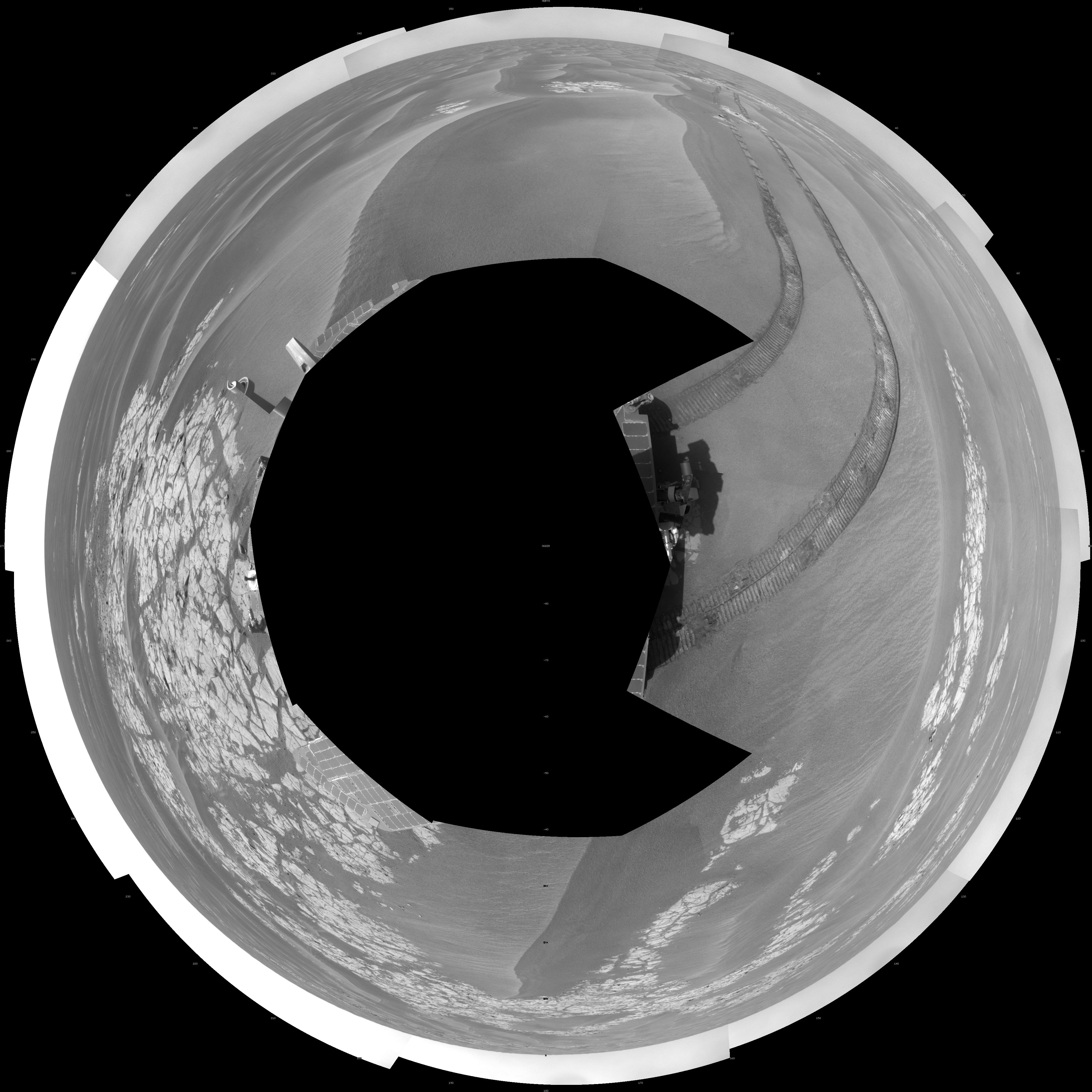 NASA's Mars Exploration Rover Opportunity used its navigation camera to take the images combined into this full-circle view of the rover's surroundings during the 1,803rd and 1,804th Martian days, or sols, of Opportunity's surface mission (Feb. 18 and 19, 2009). South is at the center; north at both ends.