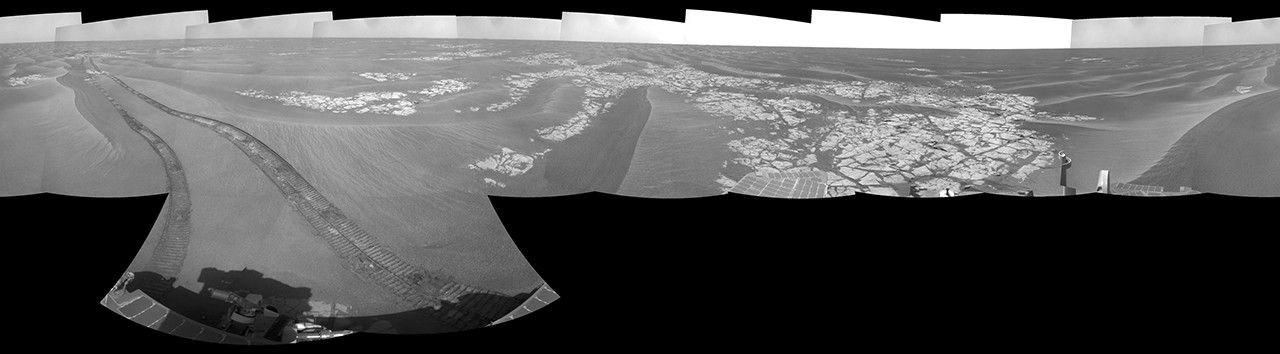 NASA's Mars Exploration Rover Opportunity used its navigation camera to take the images combined into this stereo, full-circle view of the rover's surroundings during the 1,803rd and 1,804th Martian days, or sols, of Opportunity's surface mission (Feb. 18 and 19, 2009). South is at the center; north at both ends.