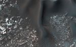 On the west (left) side of this image from NASA's Mars Reconnaissance Orbiter, fairly textbook-looking barchan sand dunes sit atop the bedrock. Barchan dunes pointing in the opposite direction are just a few kilometers away to the east.