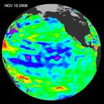 The image is based on the average of 10 days of data centered on Nov. 15, 2008, compared to the long-term average of observations from 1993 through 2008. In the image, places where the Pacific sea-surface height is higher (warmer) than normal are yellow and red, and places where the sea surface is lower (cooler) than normal are blue and purple. Green shows where conditions are near normal. Sea-surface height is an indicator of the heat content of the upper ocean.
