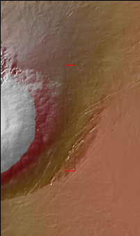 The linear features in the bottom half of this VIS image are called Oti Fossae. Oti Fossae is located on the eastern flank of Arsia Mons and aligns with the regional northeast/southwest trend of the major Tharsis volcanoes. Fossae are typically tectonic features termed graben. Graben are formed by extension of the crust and faulting. When large amounts of pressure or tension are applied to rocks on timescales that are fast enough that the rock cannot respond by deforming, the rock breaks along faults. In the case of a graben, two parallel faults are formed by extension of the crust and the rock in between the faults drops downward into the space created by the extension. The crustal deformation in this region was from the inflation of the surface by the rise of magma that created the Tharsis volcanoes.