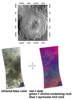 The lower right image shows spectral indicators of different materials, and reveals the composition of the crater floor and its central peak. Rocks rich in the volcanic mineral pyroxene, shown in blue, dominate the north-central part of the image. There is an enhanced content of the volcanic mineral olivine (shown in greens and yellows) in those parts of the images that appear ruddy brown in false color. The low-lying parts of the image that appear buff in false color are covered in dust, and shown in red. This view provides insight into the relationships of deposits beneath Oudemans Crater. The impact excavated the underlying olivine that that is enriched in the crater’s central peak. Pyroxene-rich material covered the crater's floor, and later, low-lying areas filled with dust.