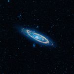 Andromeda is the closest large galaxy to our Milky Way galaxy, and is located 2.5 million light-years from our sun. It is close enough for telescopes to spy the details of its ringed arms of new stars and hazy blue backbone of older stars. Also seen in the mosaic are two satellite galaxies, known as M32, located just a bit above Andromeda to the left of center, and the fuzzy blue M110, located below the center of the great spiral arms. These satellites are the largest of several that are gravitationally bound to Andromeda.