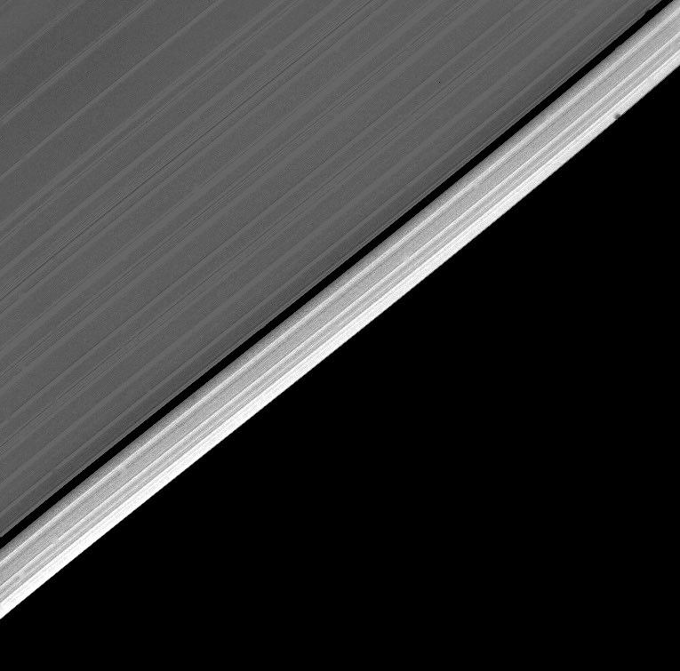 The outer edge of Saturn's A-ring is detailed in this image obtained by Voyager 2 on Aug. 26, just half an hour before closest approach, at a range of about 51,000 kilometers (31,700 miles). Resolution in this wide-angle view is about 4 km. (2.5 miles). The many sharp linear features parallel to the ring edge are most probably locations where ring particles are in resonance with one of the several small nearby satellites of about 100-km. radius discovered last fall by Voyager 1. Such regions are likely characterized by more intense particle collisions and a greater density of small "chips." The entire outer band of the A-ring has different scattering properties and therefore different particle characteristics than the main body of the rings to the upper left. The Voyager project is managed for NASA by the Jet Propulsion Laboratory, Pasadena, Calif.