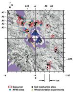 Overhead view of the area surrounding the Pathfinder lander illustrating the Sojourner traverse. Red rectangles are rover positions at the end of sols 1-30. Locations of soil mechanics experiments, wheel abrasion experiments, and APXS measurements are shown. The A numbers refer to APXS measurements as discussed in the paper by Rieder et al. (p. 1770, Science Magazine, see image note). Coordinates are given in the LL frame.