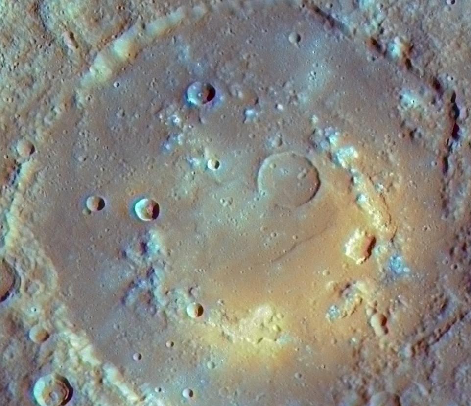 The image shown here is similar to one recently published in the 1 May issue of Science magazine. This image was created by first mosaicking together the highest-resolution NAC images available of Praxiteles (one of which is shown in the previous web release), to produce complete coverage of the crater. Independently, an enhanced-color image of Praxiteles was created by using images from all 11 WAC narrow-band color filters. (Visit last week's web release for more examples of enhanced-color images PIA12051.) The WAC images provide important color information, but the WAC resolution is considerably less than that of the mosaicked NAC images. Thus, by overlaying a slightly transparent version of the WAC enhanced-color image on the high-resolution NAC mosaic, the high-resolution color view of Praxiteles crater shown here was produced. This overlay-color view helps associate the color features with the morphologic surface features. The fact that the irregularly shaped depressions on the floor of Praxiteles are associated with bright orange and yellow color features provides evidence that the depressions may be related to past volcanic activity in this area of Mercury.